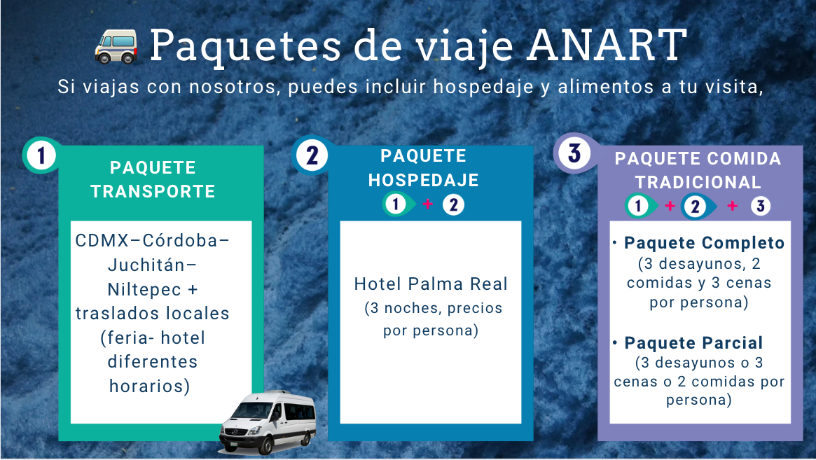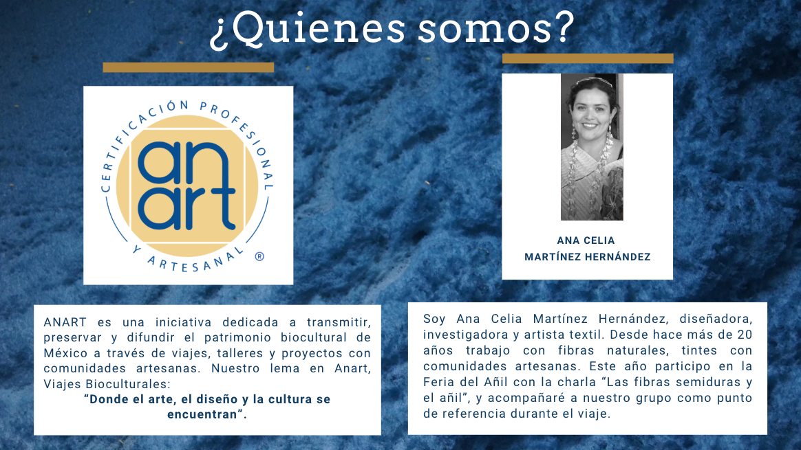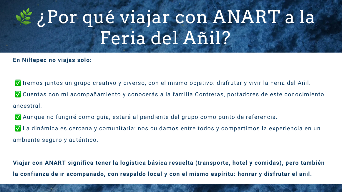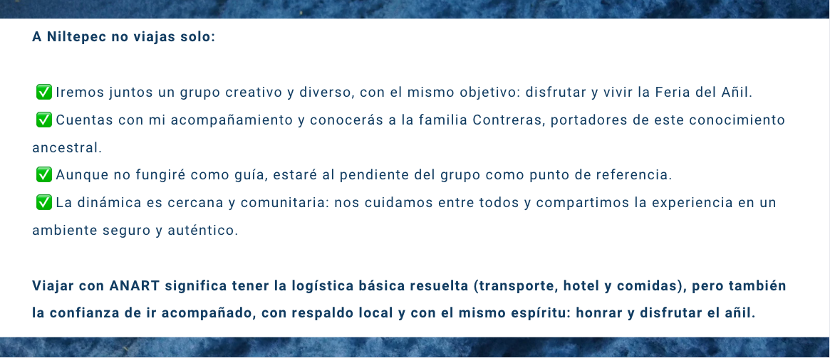 En esta propuesta viaje a la 3ª Feria del añil, no vas sola/o vas con el equipo de ANART, que aunque no fungiremos como guías dentro de la feria, sí seremos tus guías durante el recorrido a Niltepec. En Niltepec nos esperan personas con quienes compartimos el amor por el azul, el textil y el conocimiento que brota de la tierra.